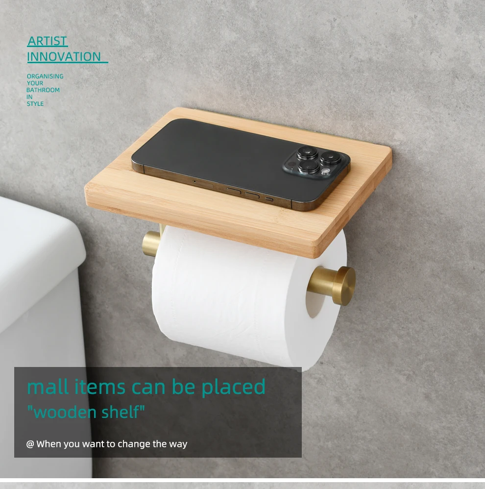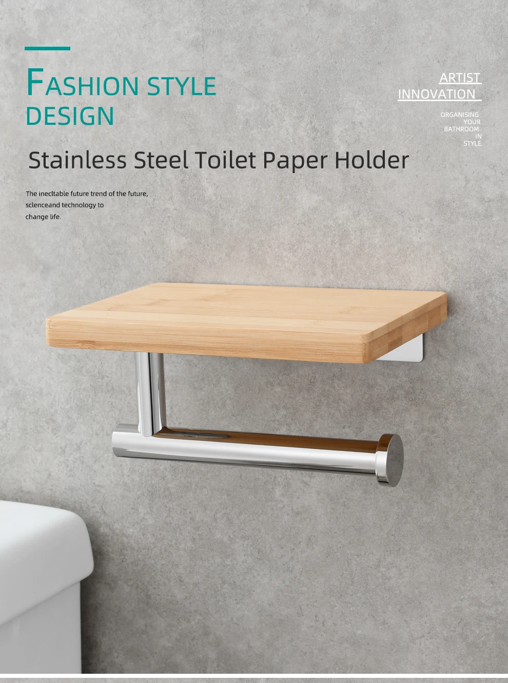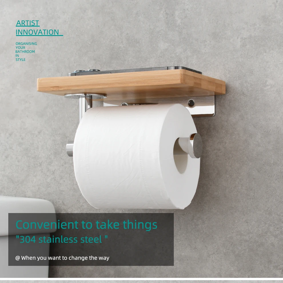 Tecmolog Stainless Steel Drilling Toilet Paper with Bamboo Shelf,Wall Mounted Tissue Roll Holder,Mirror,Nickel,Black and Brushed Gold
