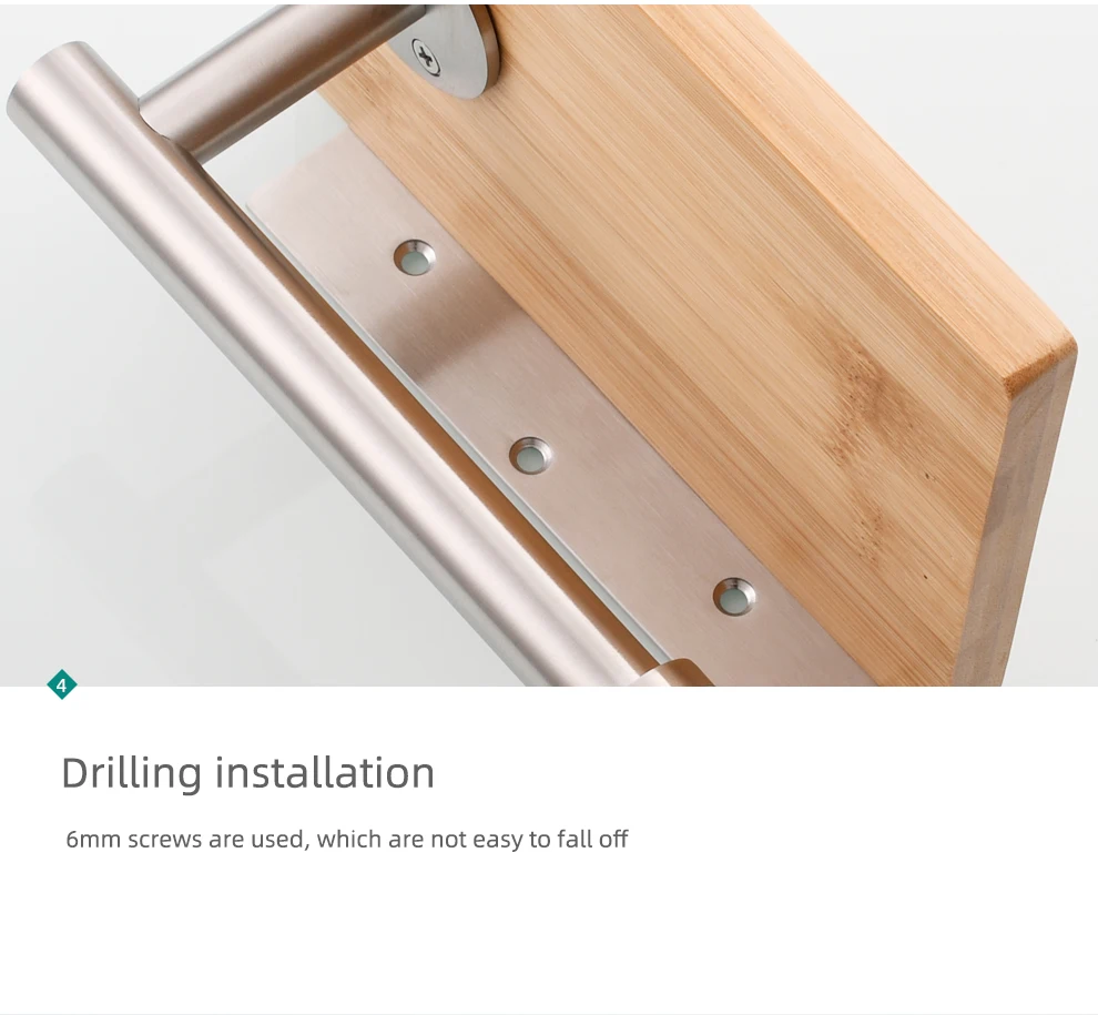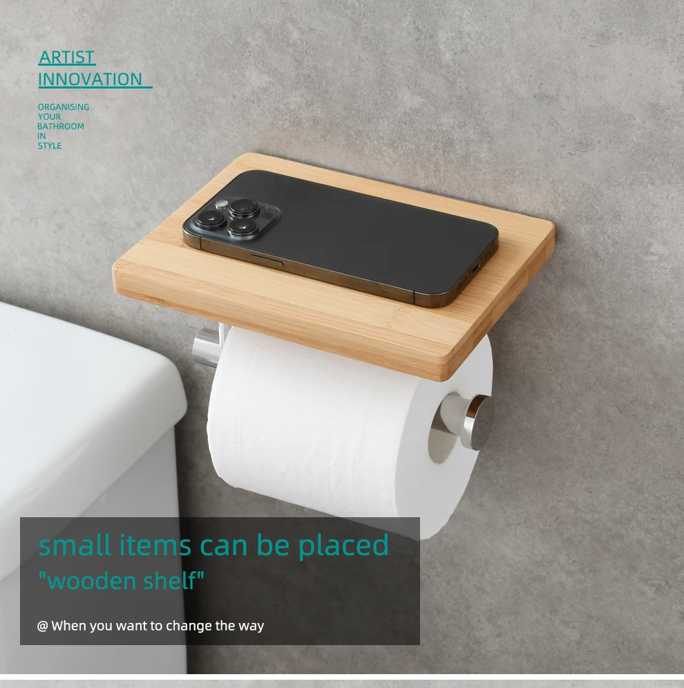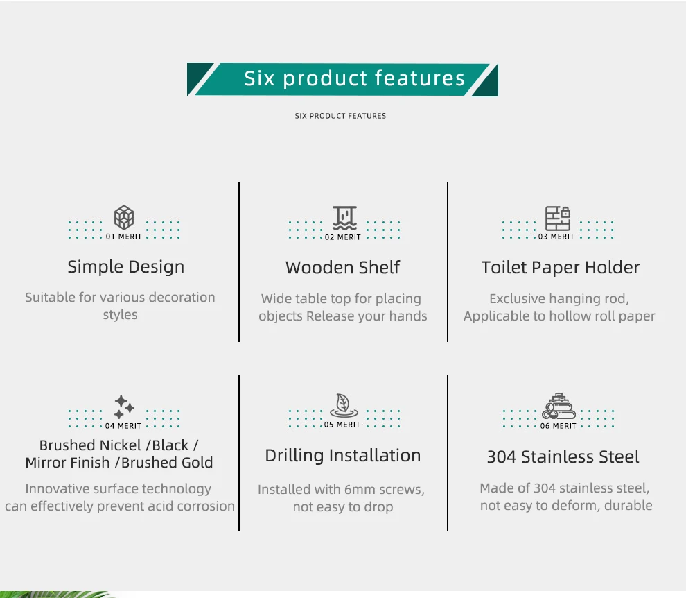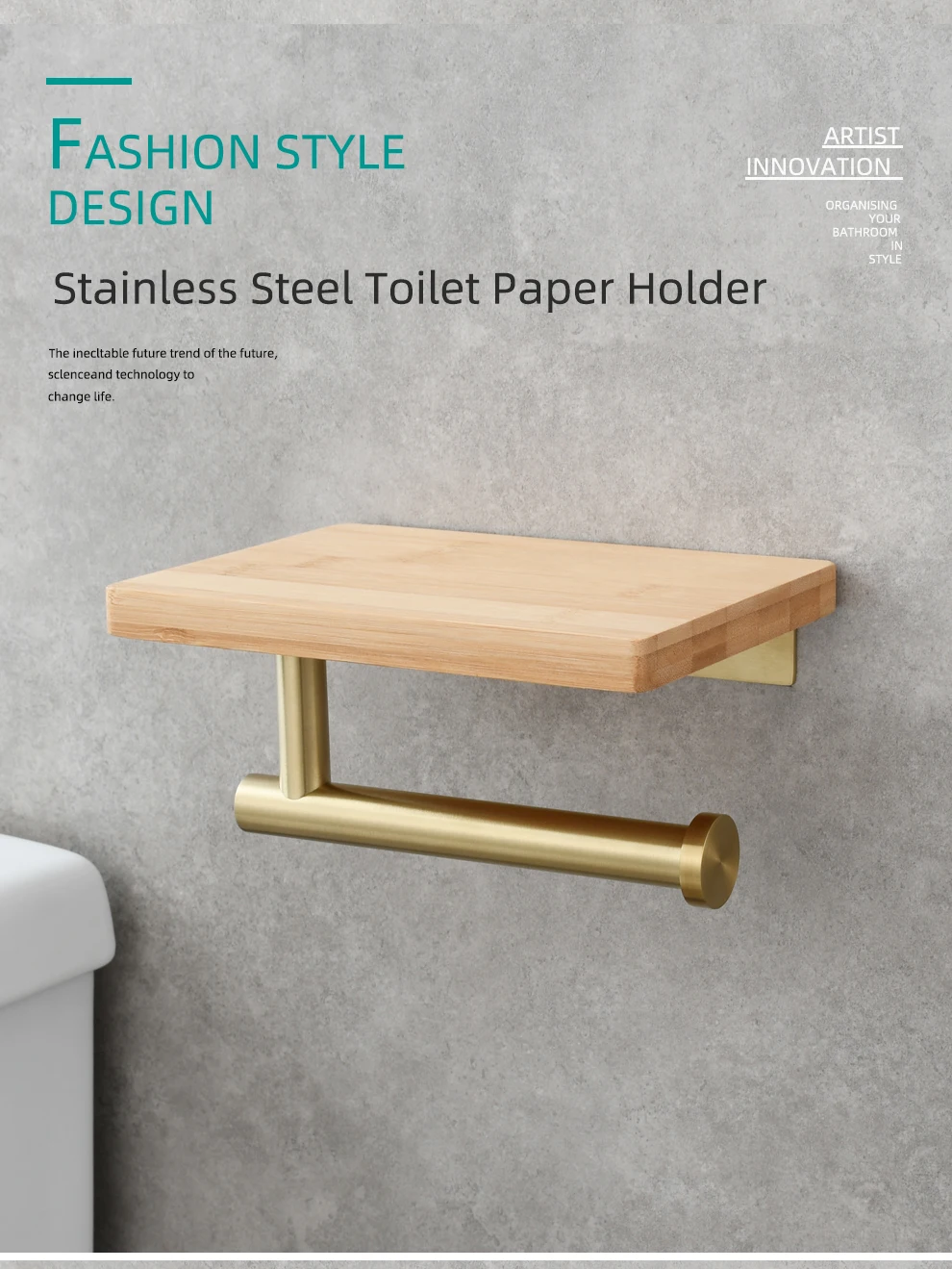 Tecmolog Stainless Steel Drilling Toilet Paper with Bamboo Shelf,Wall Mounted Tissue Roll Holder,Mirror,Nickel,Black and Brushed Gold